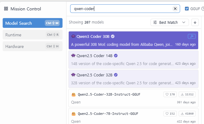 - 검색창에 "Qwen2.5-coder"를 입력합니다.