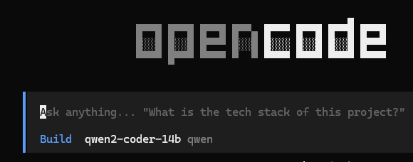 이제, 오픈코드의 프롬프트 영역 하단에서 "qwen2-coder-14b" 모델이 선택되어 있음을 확인할 수 있습니다.
